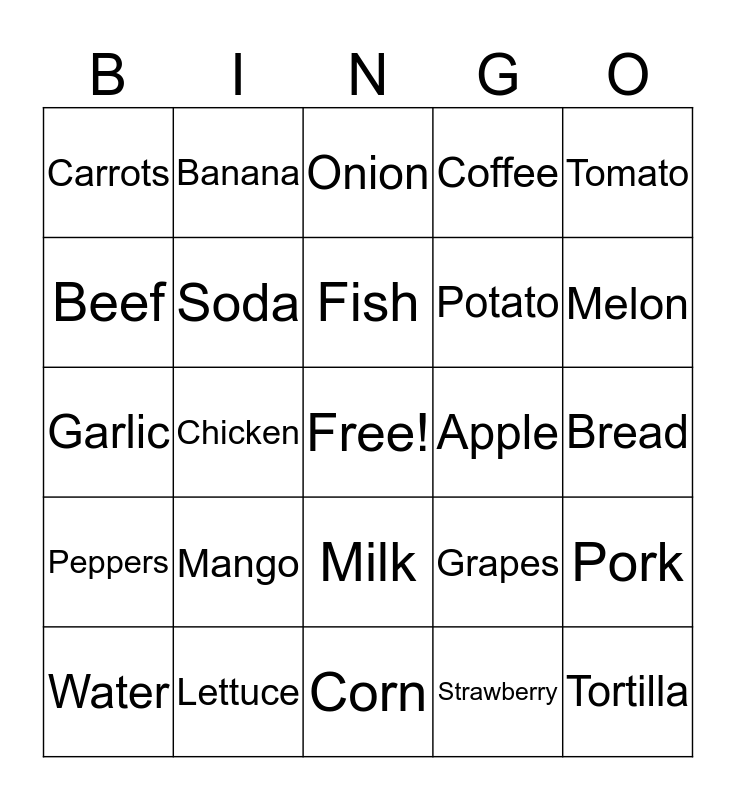This bingo card has a free space and 24 words: Mango, Lettuce, Fish, Water, Tomato, Carrots, Beef, Banana, Apple, Milk, Potato, Garlic, Grapes, Pork, Soda, Strawberry, Bread, Onion, Melon, Chicken, Tortilla, Peppers, Coffee and Corn.