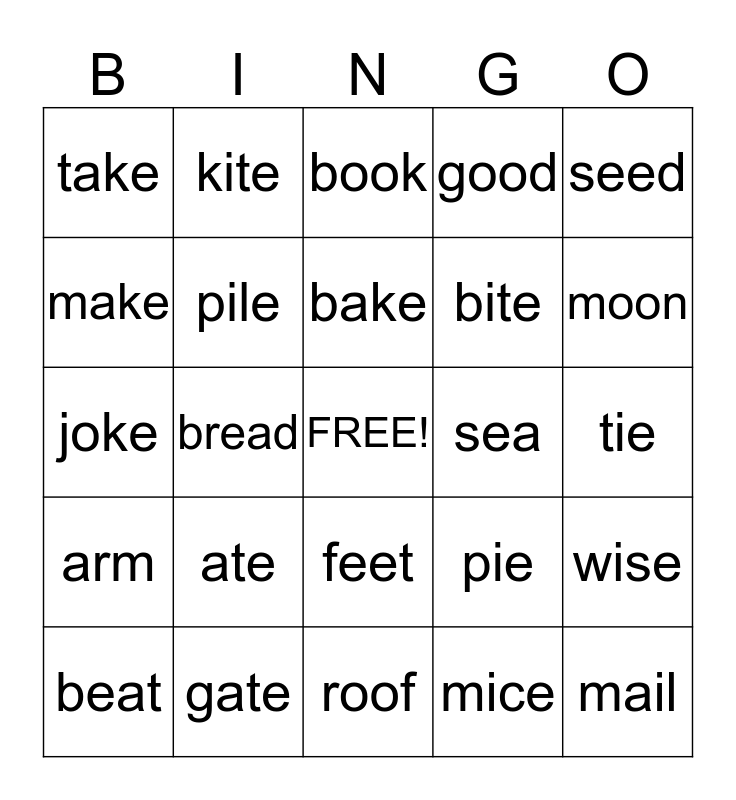 This bingo card has a free space and 24 words: ate, gate, bake, beat, seed, take, make, kite, sea, feet, bite, joke, pie, wise, pile, mice, tie, book, moon, bread, mail, arm, good and roof.