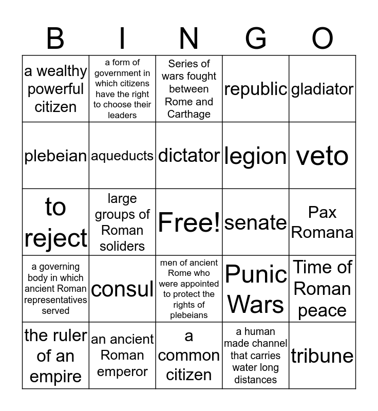 This bingo card has a free space and 24 words: consul, an ancient Roman emperor, dictator, the ruler of an empire, gladiator, a wealthy powerful citizen, plebeian, a form of government in which citizens have the right to choose their leaders, senate, men of ancient Rome who were appointed to protect the rights of plebeians, legion, to reject, Punic Wars, Time of Roman peace, aqueducts, a human made channel that carries water long distances, Pax Romana, Series of wars fought between Rome and Carthage, veto, large groups of Roman soliders, tribune, a governing body in which ancient Roman representatives served, republic and a common citizen.