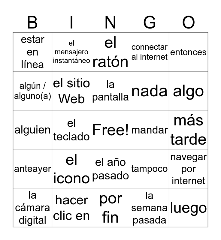 This bingo card has a free space and 29 words: la cámara digital, navegar por Internet, el teclado, la dirección electrónica, estar en línea, el ratón, el sitio Web, el icono, mandar, hacer clic en, más tarde, luego, por fin, la semana pasada, algo, nadie, el año pasado, anteayer, entonces, alguien, tampoco, ningún / ninguno(a), nada, algún / alguno(a), connectar al internet, el mensajero instantáneo, navegar por internet, la pantalla and tomar fotos.