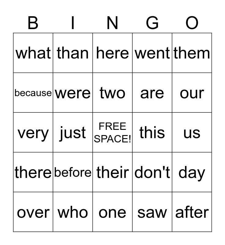 This bingo card has a free space and 34 words: been, saw, where, going, there, were, them, over, than, could, two, here, they, when, this, our, who, very, before, don't, their, I'm, what, us, one, after, went, mother, are, because, with, just, day and saw.