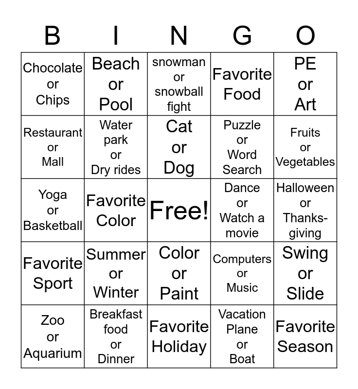 This bingo card has a free space and 24 words: Summer or Winter, Breakfast food or Dinner, Cat or Dog, Zoo or Aquarium, PE or Art, Chocolate or Chips, Restaurant or Mall, Beach or Pool, Dance or Watch a movie, Color or Paint, Puzzle or Word Search, Yoga or Basketball, Computers or Music, Swing or Slide, Water park or Dry rides, Vacation Plane or Boat, Halloween or Thanks-giving, snowman or snowball fight, Fruits or Vegetables, Favorite Color, Favorite Season, Favorite Sport, Favorite Food and Favorite Holiday.