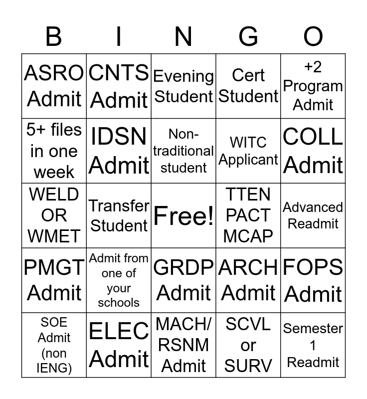 This bingo card has a free space and 24 words: Admit from one of your schools, ELEC Admit, Non-traditional student, SOE Admit (non IENG), +2 Program Admit, ASRO Admit, 5+ files in one week, CNTS Admit, TTEN PACT MCAP, GRDP Admit, WITC Applicant, WELD OR WMET, ARCH Admit, FOPS Admit, IDSN Admit, SCVL or SURV, Advanced Readmit, Evening Student, COLL Admit, Transfer Student, Semester 1 Readmit, PMGT Admit, Cert Student and MACH/ RSNM Admit.