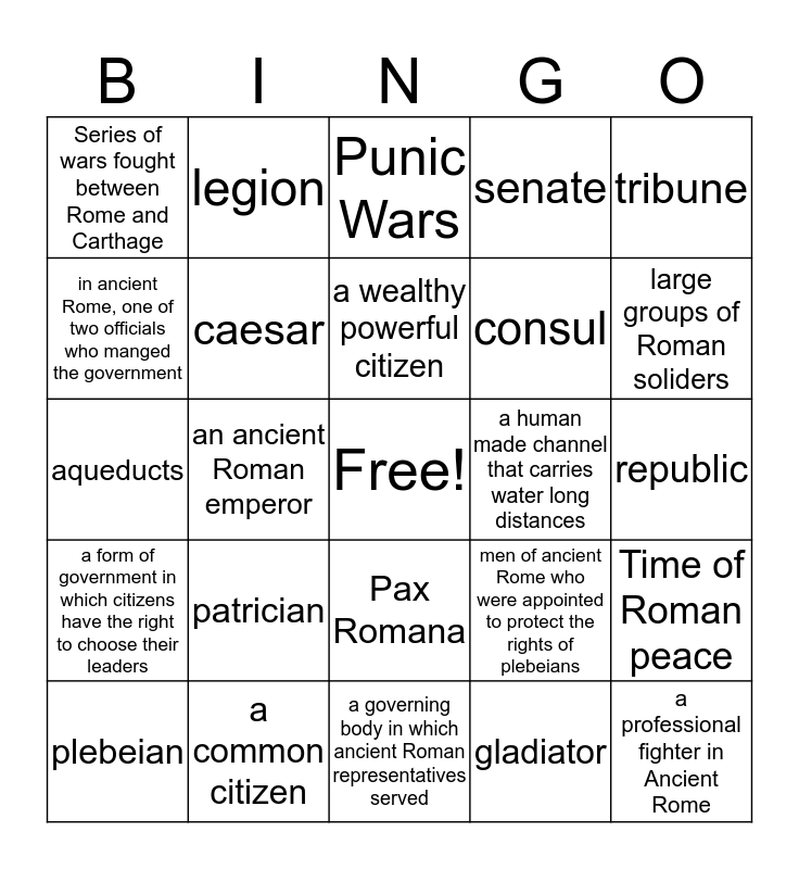 This bingo card has a free space and 24 words: patrician, a common citizen, a wealthy powerful citizen, plebeian, tribune, Series of wars fought between Rome and Carthage, in ancient Rome, one of two officials who manged the government, legion, a human made channel that carries water long distances, Pax Romana, consul, aqueducts, men of ancient Rome who were appointed to protect the rights of plebeians, Time of Roman peace, caesar, gladiator, republic, Punic Wars, large groups of Roman soliders, an ancient Roman emperor, a professional fighter in Ancient Rome, a form of government in which citizens have the right to choose their leaders, senate and a governing body in which ancient Roman representatives served.