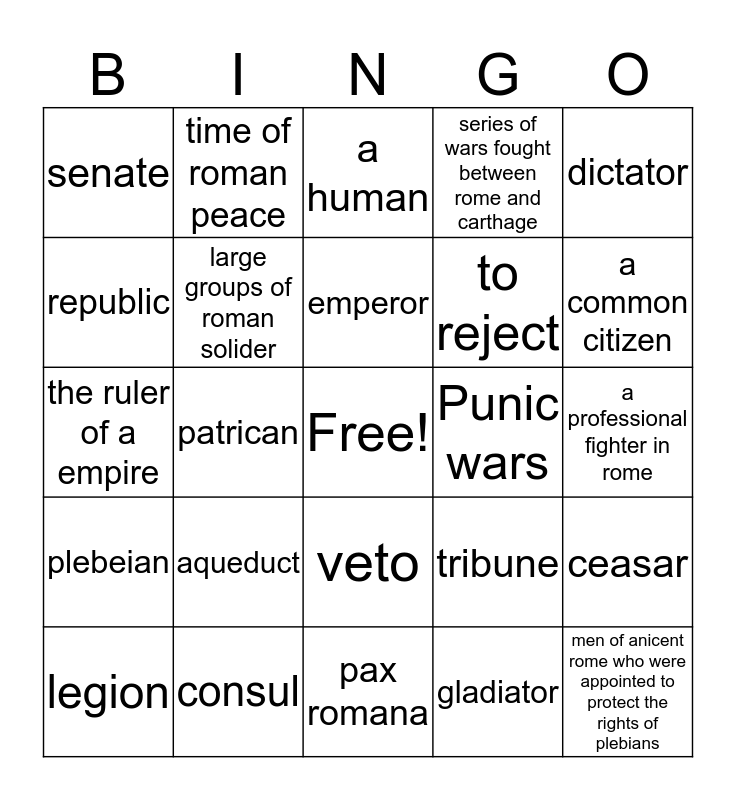 This bingo card has a free space and 24 words: aqueduct, consul, emperor, legion, dictator, senate, republic, time of roman peace, Punic wars, veto, to reject, the ruler of a empire, tribune, ceasar, large groups of roman solider, gladiator, a professional fighter in rome, a human, a common citizen, patrican, men of anicent rome who were appointed to protect the rights of plebians, plebeian, series of wars fought between rome and carthage and pax romana.