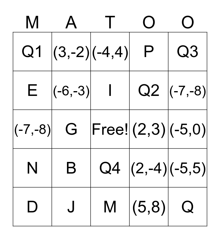 This bingo card has a free space and 24 words: B, J, I, D, Q3, Q1, E, (3,-2), (2,3), Q4, Q2, (-7,-8), (2,-4), (-5,5), (-6,-3), (5,8), (-5,0), (-4,4), (-7,-8), G, Q, N, P and M.