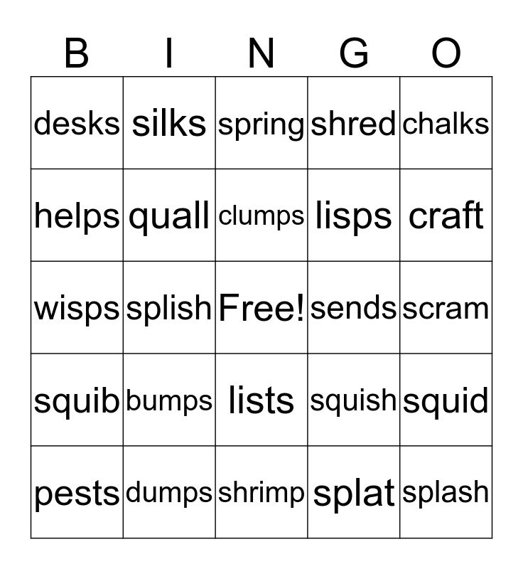 This bingo card has a free space and 24 words: bumps, dumps, clumps, pests, chalks, desks, helps, silks, sends, lists, lisps, wisps, squish, squid, quall, splat, scram, spring, craft, splish, splash, squib, shred and shrimp.