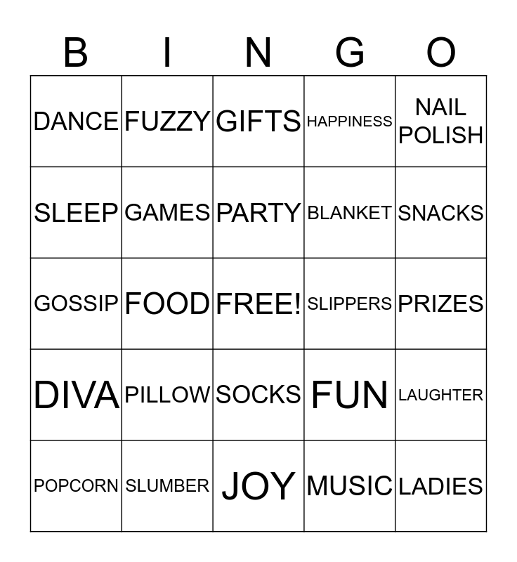 This bingo card has a free space and 24 words: PILLOW, SLUMBER, PARTY, POPCORN, NAIL POLISH, DANCE, SLEEP, FUZZY, SLIPPERS, SOCKS, BLANKET, GOSSIP, FUN, LAUGHTER, GAMES, MUSIC, PRIZES, GIFTS, SNACKS, FOOD, LADIES, DIVA, HAPPINESS and JOY.