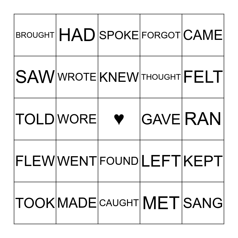 This bingo card has a free space and 24 words: WENT, MADE, KNEW, TOOK, CAME, BROUGHT, SAW, HAD, GAVE, FOUND, THOUGHT, TOLD, LEFT, KEPT, WROTE, MET, RAN, SPOKE, FELT, WORE, SANG, FLEW, FORGOT and CAUGHT.