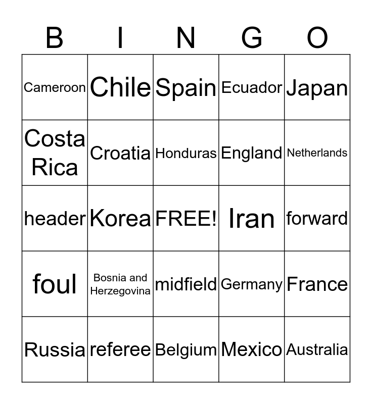 This bingo card has a free space and 51 words: Algeria, Australia, Argentina, Belgium, Bosnia and Herzegovina, Brazil, Chile, Colombia, Costa Rica, Cote d'Ivoire, Croatia, Ecuador, France, Germany, Ghana, Greece, Honduras, Iran, Italy, Japan, Korea, Mexico, Cameroon, England, USA, Portugal, Netherlands, Nigeria, Russia, Spain, Switzerland, Uruguay, GOAL!, yellow card, red card, referee, loss, champion, elimination, penalty kick, forward, foul, offside, goalkeeper, corner kick, strikers, header, sweeper, pass, midfield and offense.
