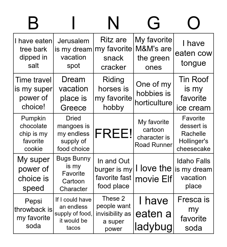This bingo card has a free space and 24 words: Bugs Bunny is my Favorite Cartoon Character, If I could have an endless supply of food, it would be tacos, Riding horses is my favorite hobby, Pepsi throwback is my favorite soda, I have eaten cow tongue, I have eaten tree bark dipped in salt, Time travel is my super power of choice!, Jerusalem is my dream vacation spot, My favorite cartoon character is Road Runner, In and Out burger is my favorite fast food place, One of my hobbies is horticulture, Pumpkin chocolate chip is my favorite cookie, I love the movie Elf, Idaho Falls is my dream vacation place, Dream vacation place is Greece, I have eaten a ladybug, Favorite dessert is Rachelle Hollinger's cheesecake, Ritz are my favorite snack cracker, Tin Roof is my favorite ice cream, Dried mangoes is my endless supply of food choice, Fresca is my favorite soda, My super power of choice is speed, My favorite M&M's are the green ones and These 2 people want invisibility as a super power.
