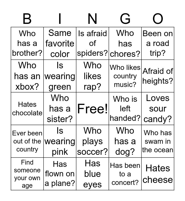 This bingo card has a free space and 29 words: Find someone your own age, Who likes broccoli?, Who has a sister?, Loves math, Who has a brother?, Is afraid of spiders?, Is wearing green, Is wearing pink, Who is left handed?, Has flown on a plane?, Loves sour candy?, Hates cheese, Has blue eyes, Has been to a concert?, Afraid of heights?, Wears glasses, Who plays soccer?, Ever been out of the country, Been on a road trip?, Hates chocolate, Who has a dog?, Who has a cat?, Who likes country music?, Who has an xbox?, Who has chores?, Same favorite color, Who has swam in the ocean, Who likes rap? and Same first letter of your name?.