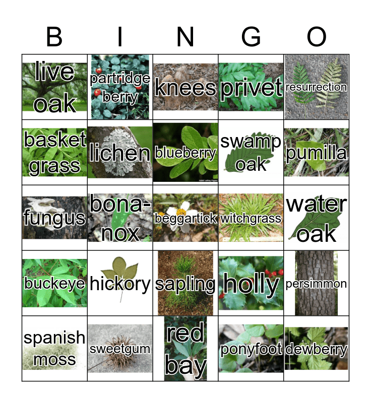 This bingo card has 28 images and 28 words: persimmon, laurel oak, swamp oak, ponyfoot, basket grass, knees, partridge berry, buckeye, witchgrass, spanish moss, fungus, privet, sweetgum, red bay, pumilla, magnolia, hickory, lichen, blueberry, sapling, live oak, dewberry, beggartick, bona-nox, water oak, holly, resurrection and saw palm.