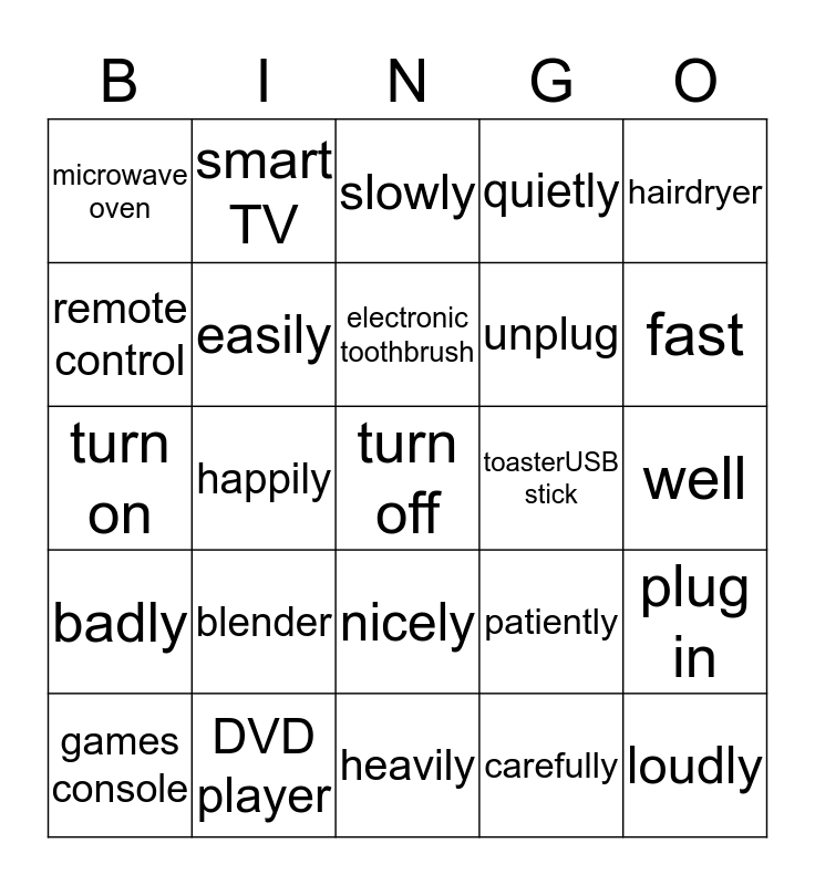 This bingo card has a free space and 24 words: blender, DVD player, electronic toothbrush, games console, hairdryer, microwave oven, remote control, smart TV, toasterUSB stick, nicely, unplug, turn on, patiently, plug in, easily, carefully, well, slowly, fast, happily, loudly, badly, quietly and heavily.