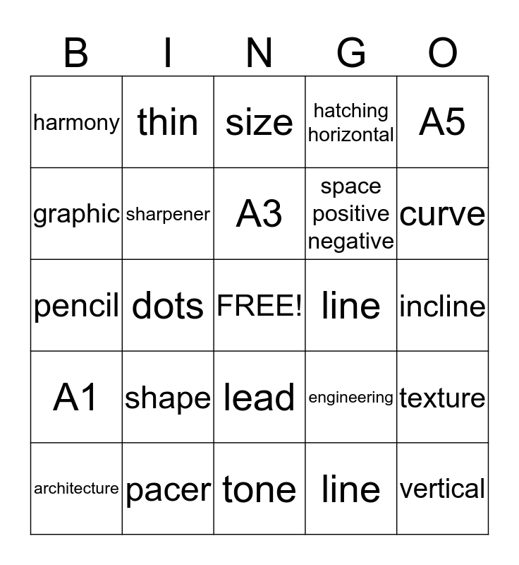 This bingo card has a free space and 41 words: Ruler scissors square, pencil, lead, sharpener, pacer, lead, A3, A4, A5, A1, dots, hatching horizontal, vertical, incline, line, shape, balance, harmony, direction, size, texture, colour, tone, space positive negative, vanishing, horizon, line, perspective diagonal vertical, curve, thick, thin parallel interrupted line, thin, architecture, graphics, engineering, graphic, design, patterns, fashion, plans and elevations.