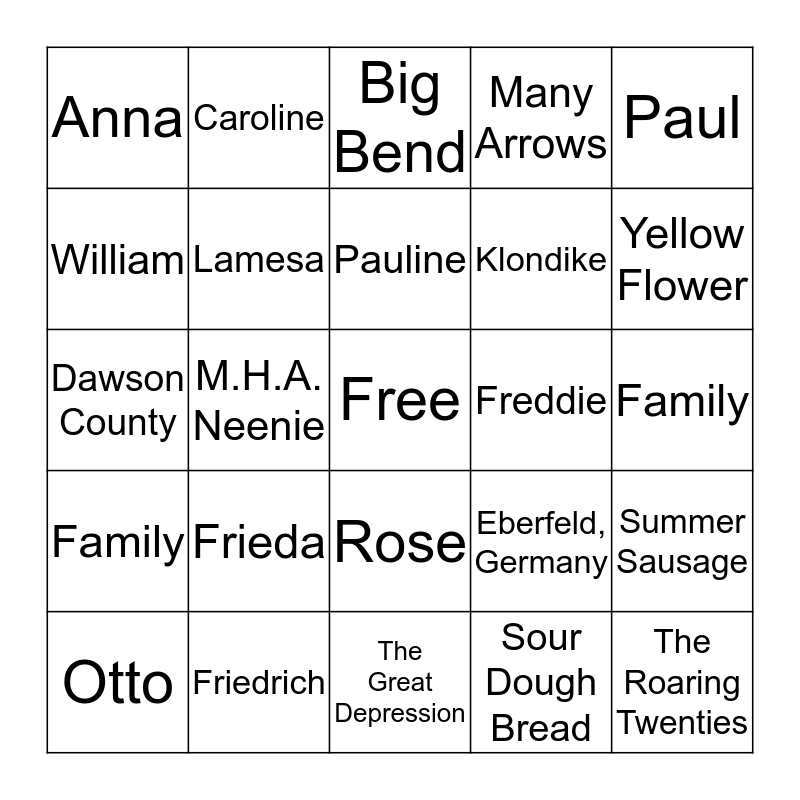 This bingo card has a free space and 24 words: Frieda, Friedrich, Pauline, Otto, Paul, Anna, William, Caroline, Freddie, Rose, Klondike, Dawson County, Eberfeld, Germany, Summer Sausage, Lamesa, Sour Dough Bread, Family, Big Bend, Yellow Flower, M.H.A. Neenie, The Roaring Twenties, Family, Many Arrows and The Great Depression.