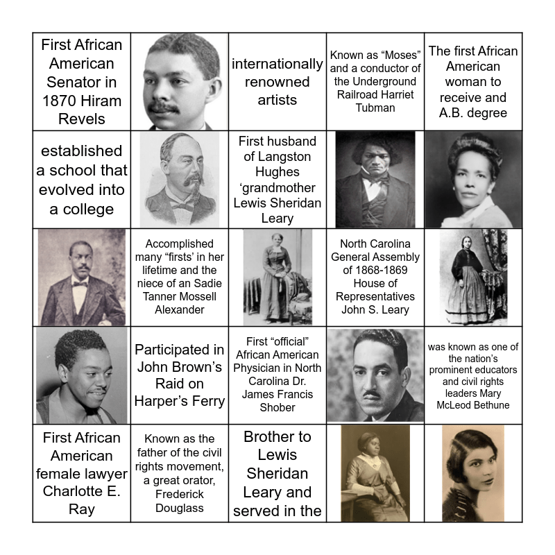 This bingo card has 14 images, a free space and 25 words: Participated in John Brown’s Raid on Harper’s Ferry, First husband of Langston Hughes ‘grandmother Lewis Sheridan Leary, Recruited by Lewis Sheridan Leary to join John Brown’s Raid on Harper’s Ferry John L. Copeland, Jr, First African American Senator in 1870 Hiram Revels, First African American Supreme Court Justice Thurgood Marshall, Brother to Lewis Sheridan Leary and served in the, North Carolina General Assembly of 1868-1869 House of Representatives John S. Leary, First African American female lawyer Charlotte E. Ray, Accomplished many “firsts’ in her lifetime and the niece of an Sadie Tanner Mossell Alexander, internationally renowned artists, first accredited African American Architect Robert Robinson Taylor, Wilmington native who was one of three students Major General Joseph McNeil, At North Carolina A&T University led the 1960 sit-in at, Woolworth’s in Greensboro, NC, First “official” African American Physician in North Carolina Dr. James Francis Shober, The first African American woman to receive and A.B. degree, (Bachelor’s Degree in 1862) and the maternal grandmother of famous Mary Jane Patterson, Poet Langston Hughes, Known as “Moses” and a conductor of the Underground Railroad Harriet Tubman, Led hundreds on enslaved people to freedom, Known as the father of the civil rights movement, a great orator, Frederick Douglass, activist, author, was known as one of the nation’s prominent educators and civil rights leaders Mary McLeod Bethune, established a school that evolved into a college and Organized the ( SNCC) Student nonviolent Coordinating Committee in Raleigh NC Ella Baker.