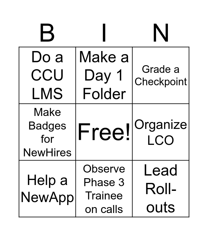 This bingo card has a free space and 16 words: Check in with 2 Trainees, Write a Trainee Note, Grade a Checkpoint, Do a CCU LMS, Sanitize 1 Row of Stations, Make a Day 1 Folder, Help Another Mentor, Set a Goal with CLM or Alison, Lead Roll-outs, Organize LCO, Take attendance for CLM, Make Badges for NewHires, Run Friday Meeting, Observe Phase 3 Trainee on calls, Help a NewApp and Call a No-show.