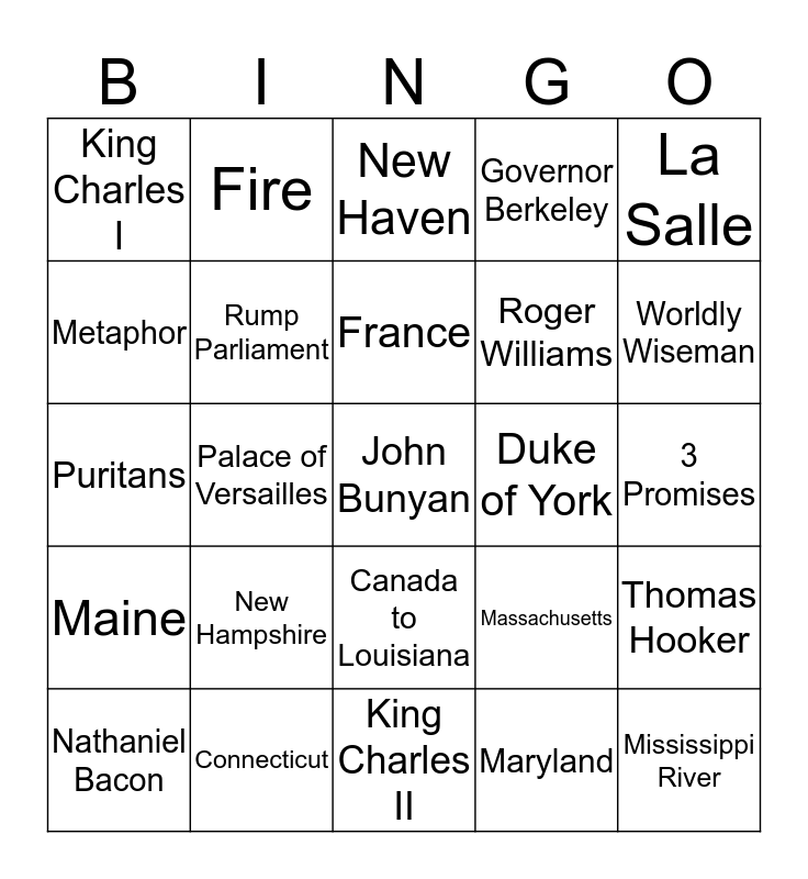 This bingo card has 55 words: English Civil War, Nathaniel Bacon, Hutchinson, King Charles I, King Charles II, Oliver Cromwell, Rump Parliament, Long Parliament, Roger Williams, Rhode Island, Governor Berkeley, Round heads, Beheaded, Cavaliers, Religious Tolerance, Sun King, La Salle, Palace of Versailles, Absolute Rule, John Bunyan, Duke of York, New York, Massachusetts, New Haven, New Jersey, France, Maryland, Pilgrim’s Progress, 3 Promises, Thomas Hooker, 1676, Louis XVI, King at 4yrs old, Pay Natives for land, Metaphor, Puritans, Church of England, Maine, Mississippi River, Plague, Fire, Exile, Rebuilt Navy, Phases of Government, New Hampshire, Connecticut, Hartford, Carolinas, Evangelist, Worldly Wiseman, Jail, The Sloth Despond, John Winthrop, Canada to Louisiana and Dutch lose control.