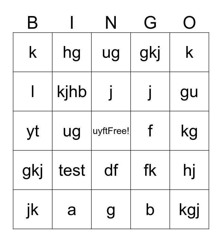 This bingo card has a free space and 24 words: test, a, j, jk, k, k, l, hg, f, df, j, yt, fk, hj, kjhb, b, kg, ug, gu, ug, kgj, gkj, gkj and g.