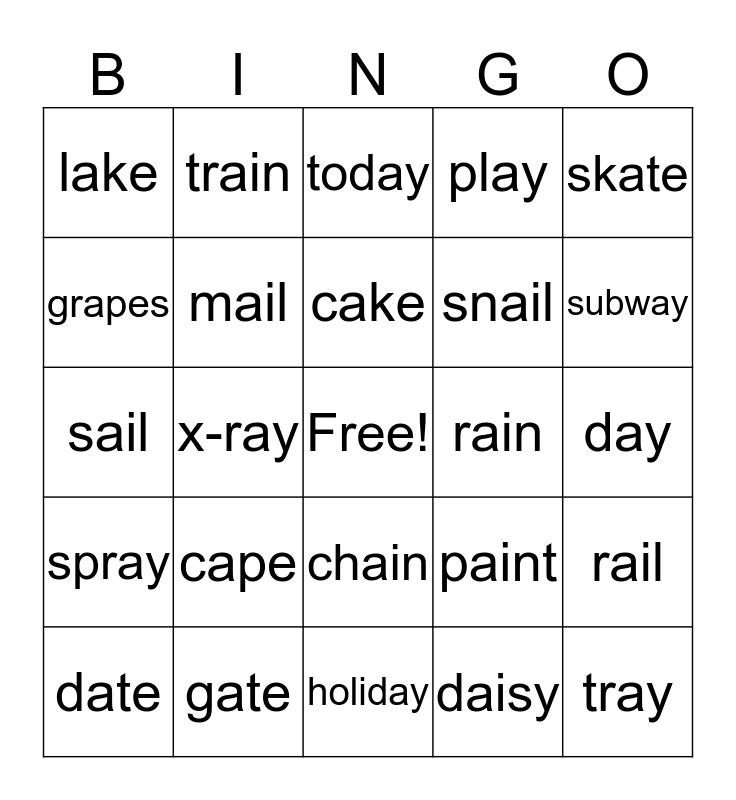 This bingo card has a free space and 24 words: cape, gate, cake, date, skate, lake, grapes, train, rain, chain, snail, sail, paint, rail, mail, daisy, day, today, subway, x-ray, tray, spray, play and holiday.