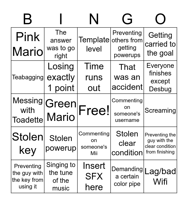 This bingo card has a free space and 30 words: Singing to the tune of the music, Parodying a song, Green Mario, Blue Mario, Pink Mario, Template level, Losing exactly 1 point, Commenting on someone's Mii, Commenting on someone's username, Insert SFX here, Screaming, Lag/bad Wifi, Demanding a certain color pipe, You broke the level, Everyone finishes except Desbug, Bulbous Head Gang, Stolen clear condition, Stolen key, Stolen powerup, Getting carried to the goal, Messing with Toadette, The mitochondria is the powerhouse of the cell, The answer was to go right, That was an accident, Teabagging, Preventing others from getting powerups, Preventing the guy with the clear condition from finishing, Preventing the guy with the key from using it, Time runs out and Purposefully killing someone.