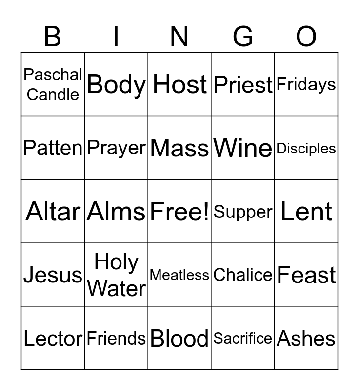 This bingo card has a free space and 27 words: Chalice, Cup, Wine, Blood, Patten, Host, Body, Jesus, Supper, Feast, Altar, Priest, Lector, Friends, Disciples, Bible, Prayer, Mass, Holy Water, Paschal Candle, Lent, Sacrifice, Alms, Ashes, Meatless, Fridays and Stations of the Cross.