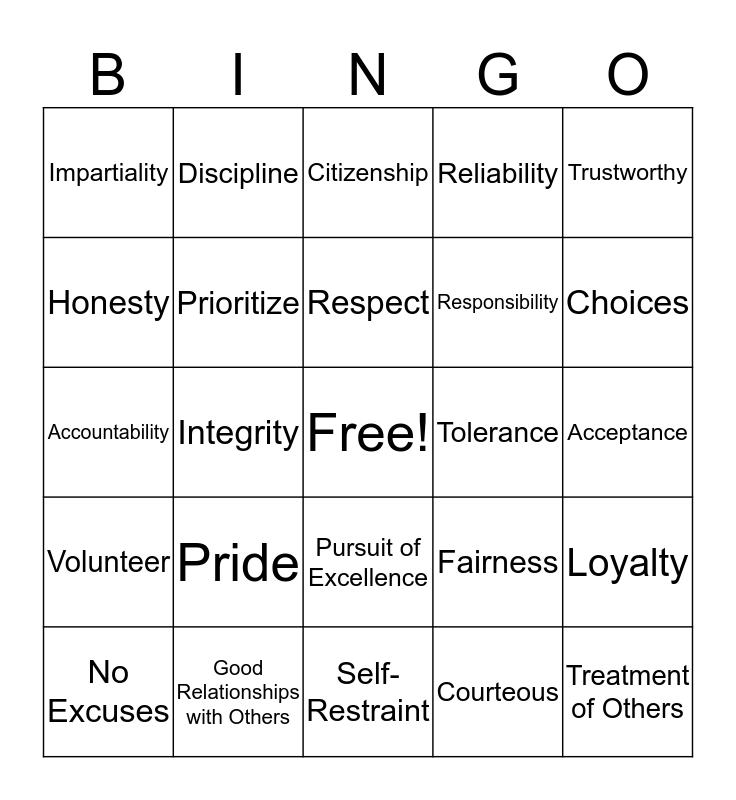 This bingo card has a free space and 24 words: Pride, Good Relationships with Others, Respect, No Excuses, Trustworthy, Impartiality, Honesty, Discipline, Tolerance, Pursuit of Excellence, Responsibility, Accountability, Fairness, Loyalty, Prioritize, Courteous, Acceptance, Citizenship, Choices, Integrity, Treatment of Others, Volunteer, Reliability and Self-Restraint.