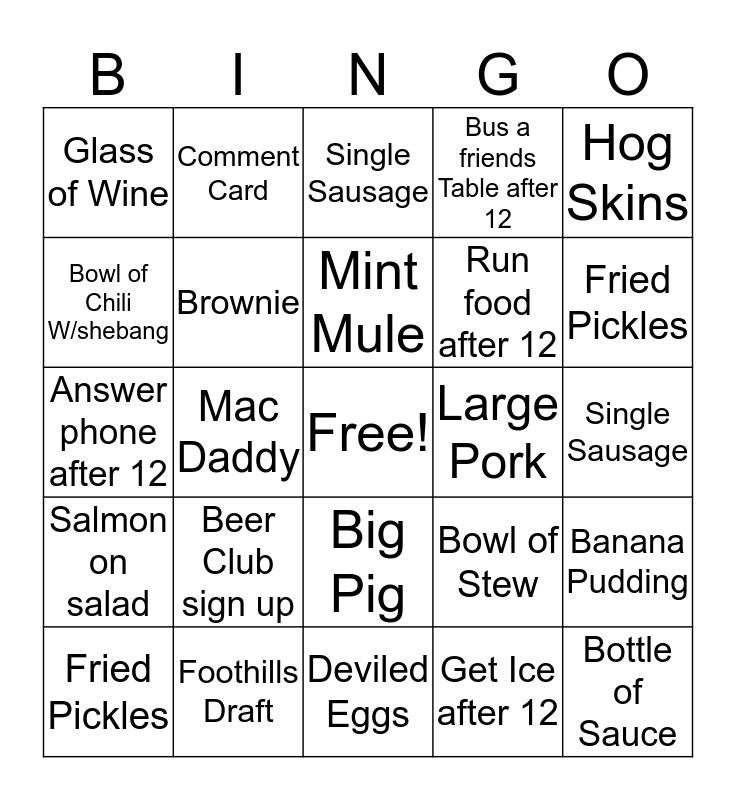 This bingo card has a free space and 24 words: Beer Club sign up, Foothills Draft, Mint Mule, Fried Pickles, Hog Skins, Glass of Wine, Bowl of Chili W/shebang, Comment Card, Large Pork, Big Pig, Run food after 12, Answer phone after 12, Bowl of Stew, Banana Pudding, Brownie, Get Ice after 12, Single Sausage, Single Sausage, Fried Pickles, Mac Daddy, Bottle of Sauce, Salmon on salad, Bus a friends Table after 12 and Deviled Eggs.