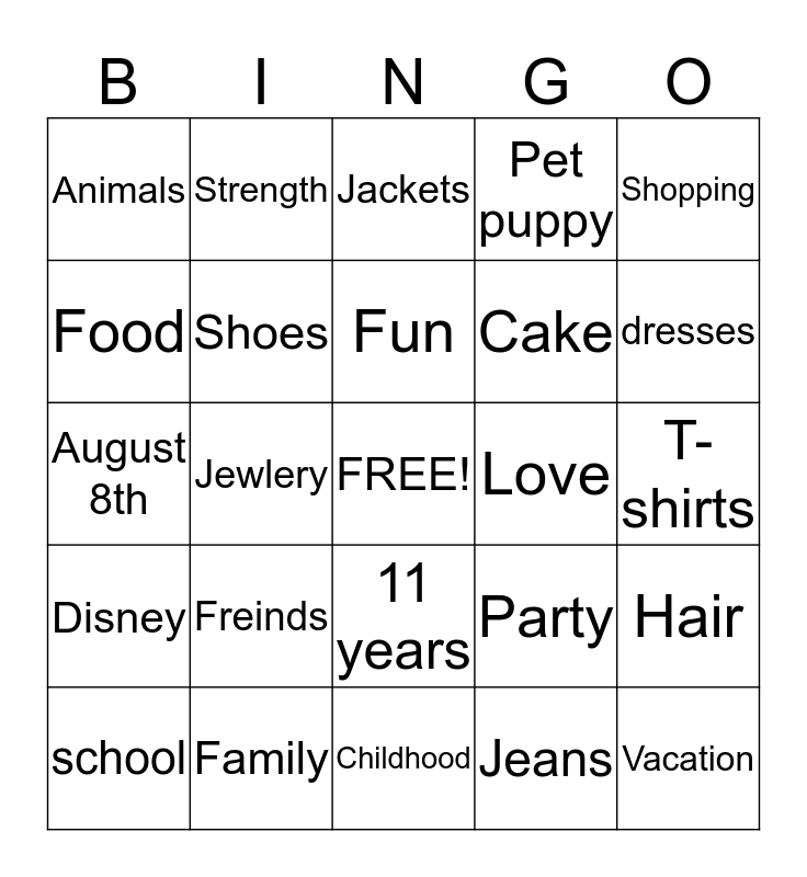 This bingo card has a free space and 24 words: Freinds, Family, Fun, school, Shopping, Animals, Food, Strength, Love, 11 years, Cake, August 8th, Party, Hair, Shoes, Jeans, T-shirts, Jackets, dresses, Jewlery, Vacation, Disney, Pet puppy and Childhood.