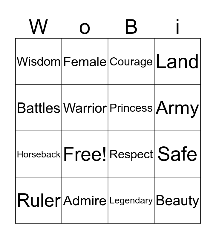 This bingo card has 18 words: Free!, Beauty, Courage, Wisdom, Respect, Land, Ruler, Female, Army, Horseback, Legendary, Battles, Safe, Warrior, Princess, State, Admire and Figure.