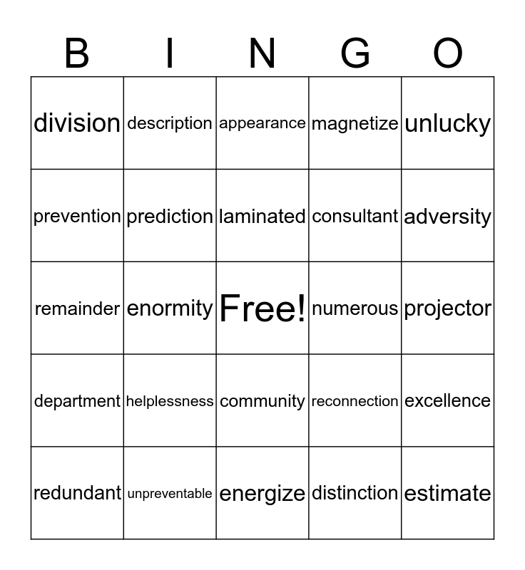 This bingo card has a free space and 24 words: helplessness, unpreventable, laminated, redundant, unlucky, division, prevention, description, numerous, community, consultant, remainder, reconnection, excellence, prediction, distinction, projector, appearance, adversity, enormity, estimate, department, magnetize and energize.