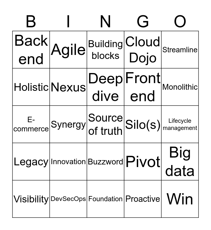 This bingo card has 53 words: Free!, Source of truth, Automation, Proactive, Innovation, Next gen, Agile, Cloud native, Holistic, Programmatic, Nexus, Business agility, Big data, Pivot, Pain point, Visibility, Deep dive, Silo(s), Organic, Streamline, Synergy, Win, Front end, Back end, DevOps, DevSecOps, Container, _aaS, Virtualization, Monolithic, Micro service, Responsive, Framework, Cloud computing, Bleeding edge, Cutting edge, Cloud Dojo, Foundation, Building blocks, Engagement, Cookie cutter, End of life, Lifecycle management, Succinct, Culture, Buzzword, Deeper dive, MVP, E-commerce, Legacy, Leverage, AI Ops and Observability.