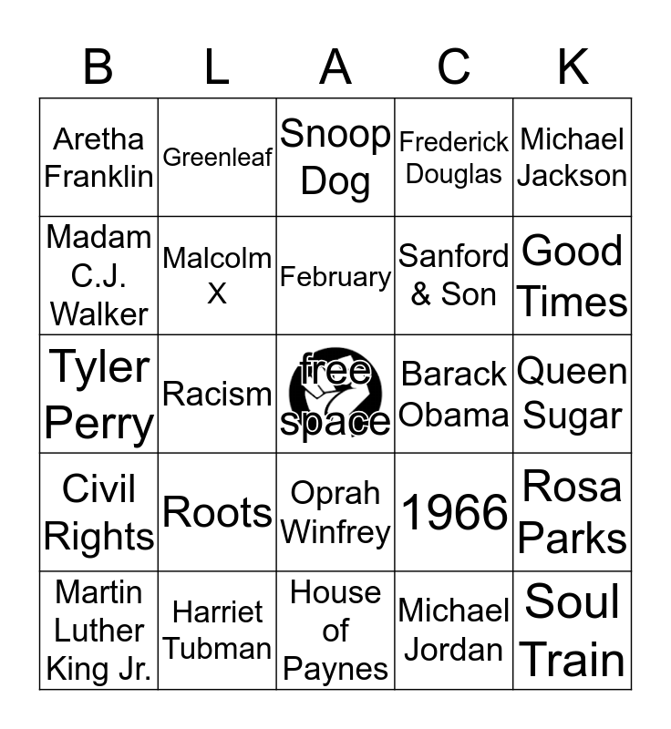 This bingo card has a free space and 35 words: Muhammed Ali, Tina Turner, Haves & Haves Not, Malcolm X, Oprah Winfrey, Frederick Douglas, Madam C.J. Walker, Natalie Cole, February, NAACP, Tyler Perry, Michael Jackson, Isaac Hayes, Ray Charles, Aretha Franklin, Barack Obama, Michael Jordan, Racism, Civil Rights, Soul Train, 1966, Martin Luther King Jr., Rosa Parks, Harriet Tubman, Snoop Dog, Good Times, The Jeffersons, The Cosby Show, Sanford & Son, Queen Sugar, Empire, House of Paynes, Roots, Greenleaf and Luther Vandross.
