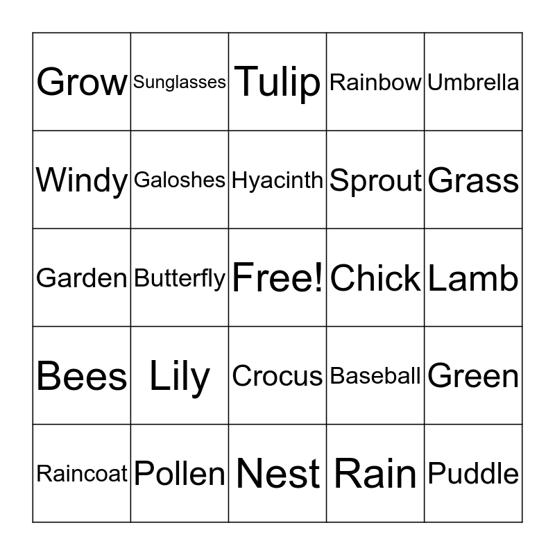 This bingo card has a free space and 34 words: Flowers, Rain, Sun, Birds, Bees, Galoshes, Umbrella, Raincoat, Sunglasses, Daffodil, Hyacinth, Tulip, Easter, Bunny, Chick, Grass, Pollen, Garden, Lily, Baseball, Crocus, Hatch, Grow, Lamb, Nest, Puddle, Rainbow, Robin, Sprout, Windy, Bloom, Butterfly, Green and Cloud.