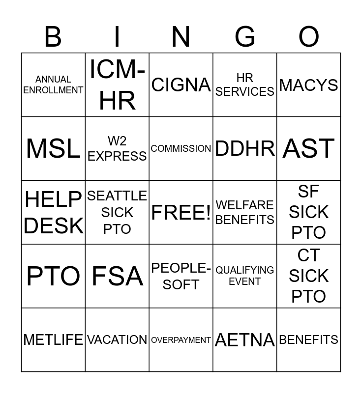 This bingo card has a free space and 24 words: FSA, VACATION, COMMISSION, METLIFE, MACYS, ANNUAL ENROLLMENT, MSL, ICM-HR, WELFARE BENEFITS, PEOPLE-SOFT, DDHR, HELP DESK, QUALIFYING EVENT, CT SICK PTO, W2 EXPRESS, AETNA, SF SICK PTO, CIGNA, AST, SEATTLE SICK PTO, BENEFITS, PTO, HR SERVICES and OVERPAYMENT.