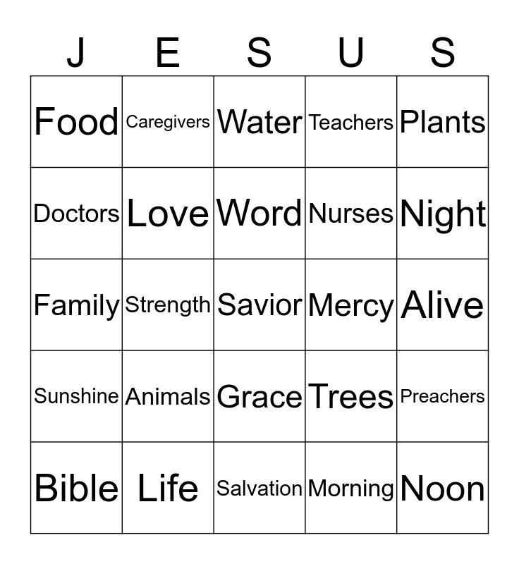 This bingo card has 30 words: Life, Health, Strength, Blessings, Food, Water, Love, Grace, Mercy, Salvation, Alive, Savior, Morning, Noon, Night, Air, Trees, Sunshine, Animals, Plants, Family, Friends, Caregivers, Nurses, Doctors, Teachers, Preachers, Bible, Word and Prayer.