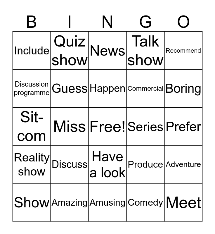This bingo card has a free space and 28 words: Adventure, Cartoon, Commercial, Comedy, Discussion programme, News, Quiz show, Reality show, Series, Show, Sit-com, Talk show, Amazing, Amusing, Boring, Creative, Discuss, Guess, Happen, Have a look, Include, Invent, Meet, Miss, Prefer, Produce, Recommend and Release.