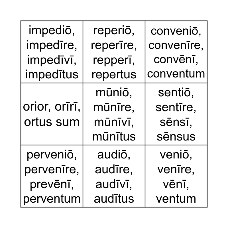 This bingo card has 10 words: audiō, audīre, audīvī, audītus, conveniō, convenīre, convēnī, conventum, impediō, impedīre, impedīvī, impedītus, mūniō, mūnīre, mūnīvī, mūnītus, orior, orīrī, ortus sum, perveniō, pervenīre, prevēnī, perventum, reperiō, reperīre, repperī, repertus, sciō, scīre, scīvī, scītus, sentiō, sentīre, sēnsī, sēnsus and veniō, venīre, vēnī, ventum.