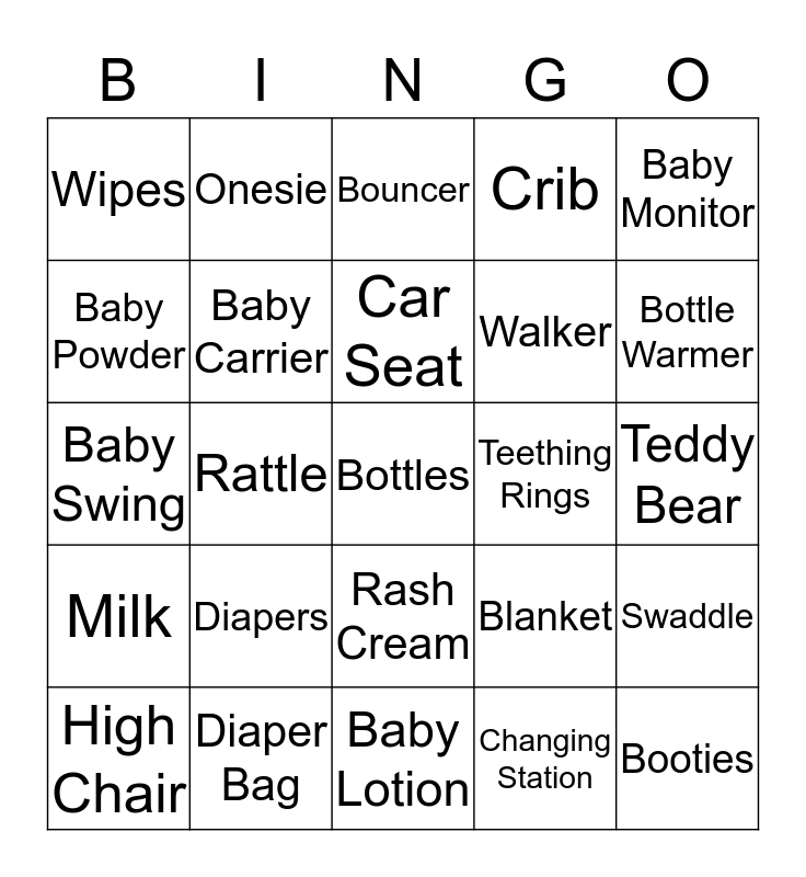 This bingo card has a free space and 24 words: Diapers, Diaper Bag, Car Seat, High Chair, Baby Monitor, Wipes, Baby Powder, Onesie, Teething Rings, Rash Cream, Walker, Baby Swing, Blanket, Swaddle, Baby Carrier, Changing Station, Teddy Bear, Bouncer, Bottle Warmer, Rattle, Booties, Milk, Crib and Baby Lotion.