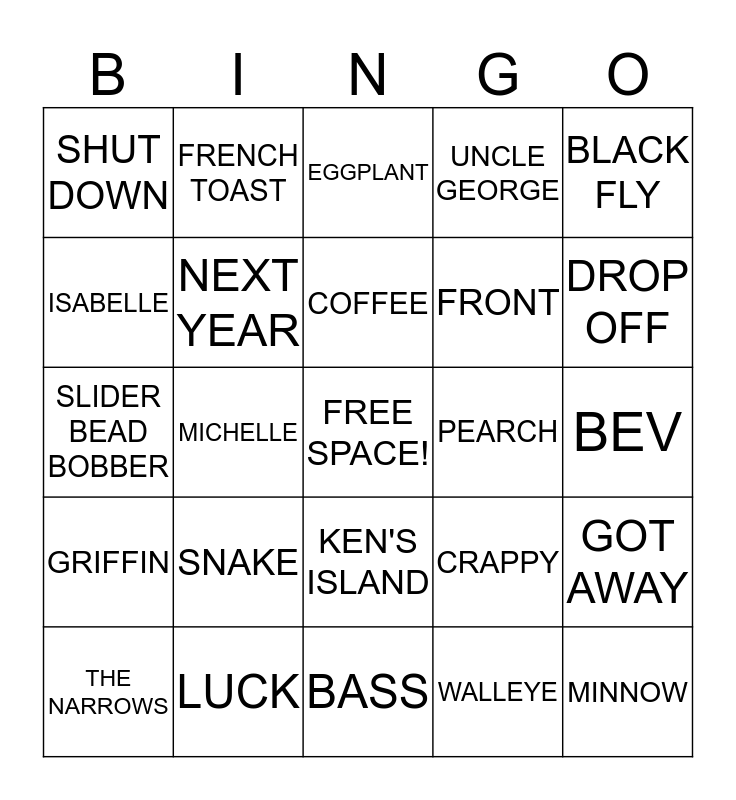 This bingo card has a free space and 24 words: SNAKE, LUCK, COFFEE, THE NARROWS, BLACK FLY, SHUT DOWN, ISABELLE, FRENCH TOAST, PEARCH, KEN'S ISLAND, FRONT, SLIDER BEAD BOBBER, CRAPPY, GOT AWAY, NEXT YEAR, WALLEYE, BEV, EGGPLANT, DROP OFF, MICHELLE, MINNOW, GRIFFIN, UNCLE GEORGE and BASS.