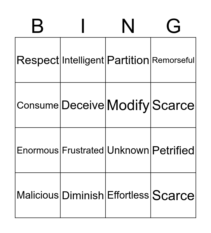 This bingo card has 20 words: Petrified, Astonished, Partition, Oblivious, Malicious, Consume, Diminish, Respect, Enormous, Intelligent, Frustrated, Unknown, Deceive, Scarce, Modify, Persuade, Scarce, Remorseful, Effortless and Timid.