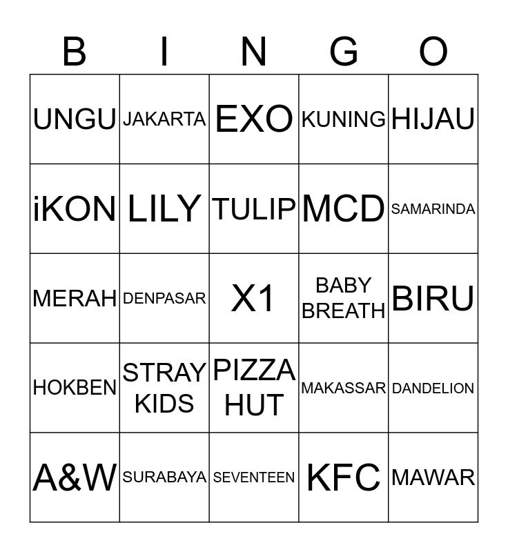 This bingo card has a free space and 24 words: STRAY KIDS, SURABAYA, TULIP, A&W, HIJAU, UNGU, iKON, JAKARTA, BABY BREATH, PIZZA HUT, MCD, MERAH, MAKASSAR, DANDELION, LILY, KFC, BIRU, EXO, SAMARINDA, DENPASAR, MAWAR, HOKBEN, KUNING and SEVENTEEN.