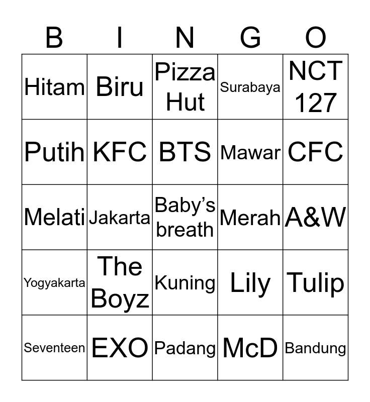 This bingo card has a free space and 24 words: The Boyz, EXO, BTS, Seventeen, NCT 127, Hitam, Putih, Biru, Merah, Kuning, Mawar, Melati, Lily, Tulip, KFC, McD, A&W, Pizza Hut, CFC, Jakarta, Bandung, Yogyakarta, Surabaya and Padang.