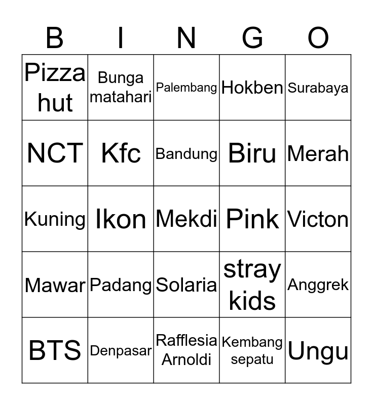 This bingo card has a free space and 24 words: Padang, Denpasar, Bandung, BTS, Surabaya, Pizza hut, NCT, Bunga matahari, Pink, Solaria, Biru, Kuning, stray kids, Anggrek, Kfc, Kembang sepatu, Victon, Palembang, Merah, Ikon, Ungu, Mawar, Hokben and Rafflesia Arnoldi.
