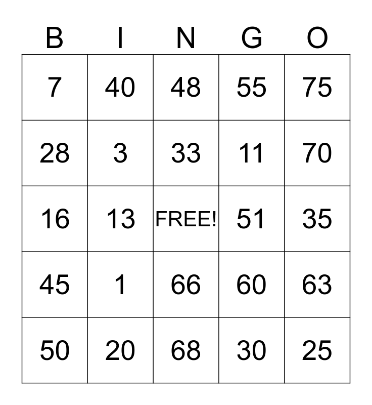 This bingo card has a free space and 24 words: 1, 20, 33, 50, 75, 7, 28, 40, 51, 66, 11, 16, 60, 63, 3, 30, 35, 48, 70, 13, 25, 45, 55 and 68.
