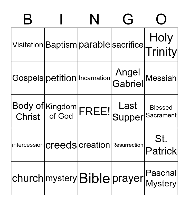 This bingo card has a free space and 24 words: creeds, mystery, Incarnation, church, Holy Trinity, Visitation, Gospels, Baptism, Last Supper, creation, Angel Gabriel, Body of Christ, Resurrection, St. Patrick, petition, prayer, Blessed Sacrament, parable, Messiah, Kingdom of God, Paschal Mystery, intercession, sacrifice and Bible.