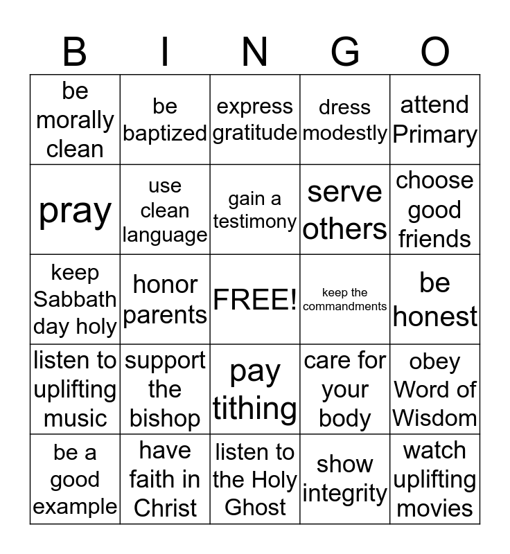 This bingo card has a free space and 24 words: support the bishop, have faith in Christ, gain a testimony, be a good example, attend Primary, be morally clean, pray, be baptized, keep the commandments, pay tithing, serve others, keep Sabbath day holy, care for your body, obey Word of Wisdom, use clean language, show integrity, be honest, express gratitude, choose good friends, honor parents, watch uplifting movies, listen to uplifting music, dress modestly and listen to the Holy Ghost.