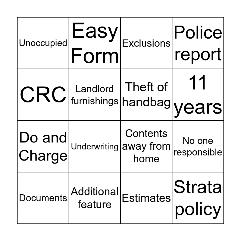 This bingo card has 28 words: Make safe, Flood, Do and Charge, Main contact, Landlord furnishings, Exclusions, Easy Form, Strata policy, Additional feature, 25,000, Contents away from home, Police report, NSW, PDS, Underwriting, Additional Cover, Removal of debris, Theft of handbag, 11 years, Food spoilage, Unoccupied, Reinsurance, Documents, No one responsible, Estimates, 10, CRC and Small claims.