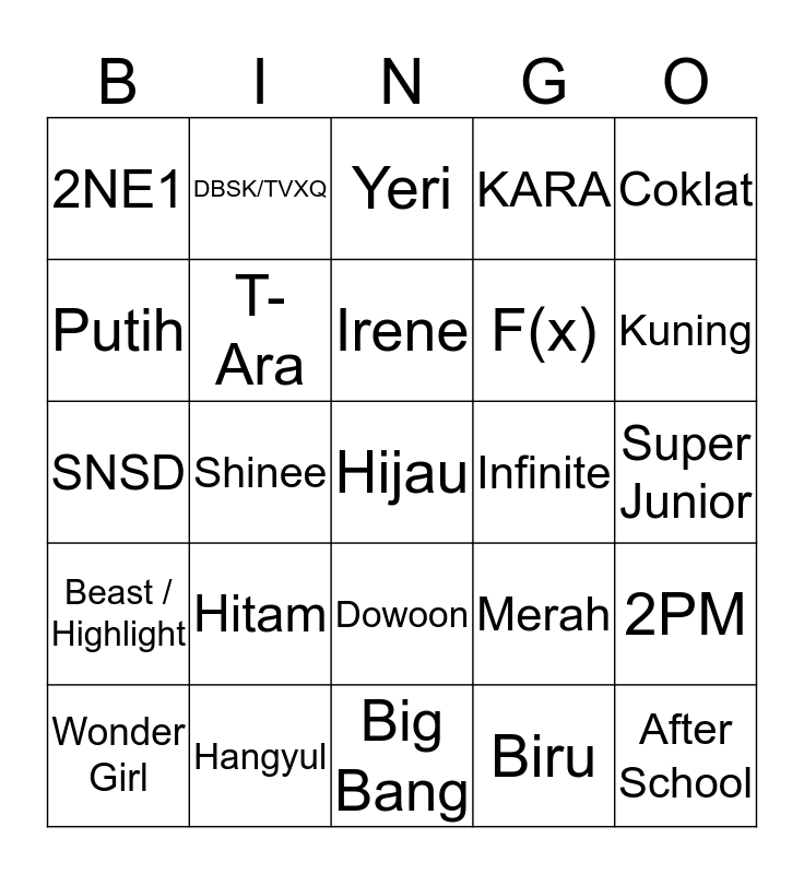This bingo card has 25 words: Hitam, Big Bang, Irene, Wonder Girl, Coklat, 2NE1, Putih, DBSK/TVXQ, Infinite, Dowoon, F(x), SNSD, Merah, 2PM, T-Ara, After School, Super Junior, Yeri, Kuning, Shinee, Hijau, Hangyul, Beast / Highlight, KARA and Biru.